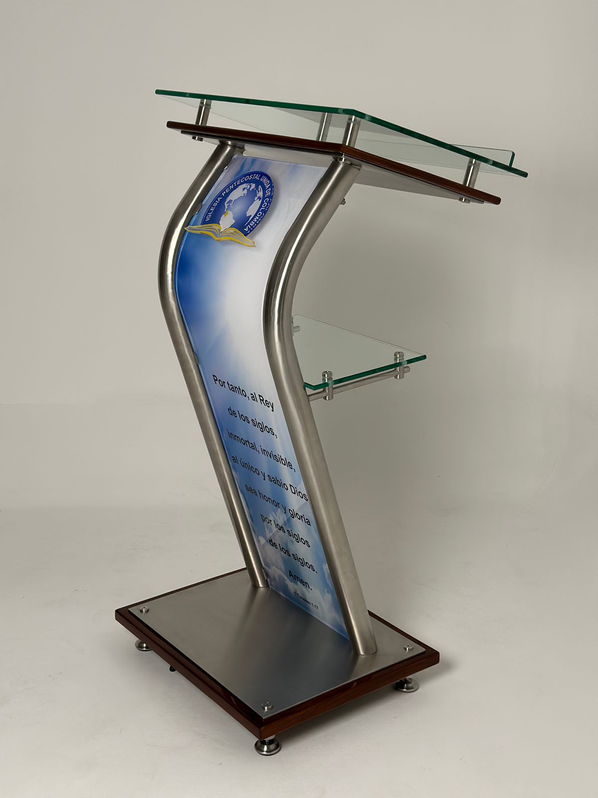It is a pulpit that can be easily transported, quickly assembled, with adjustable height and whose front image is a print that can be easily changed when the client deems it convenient.