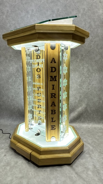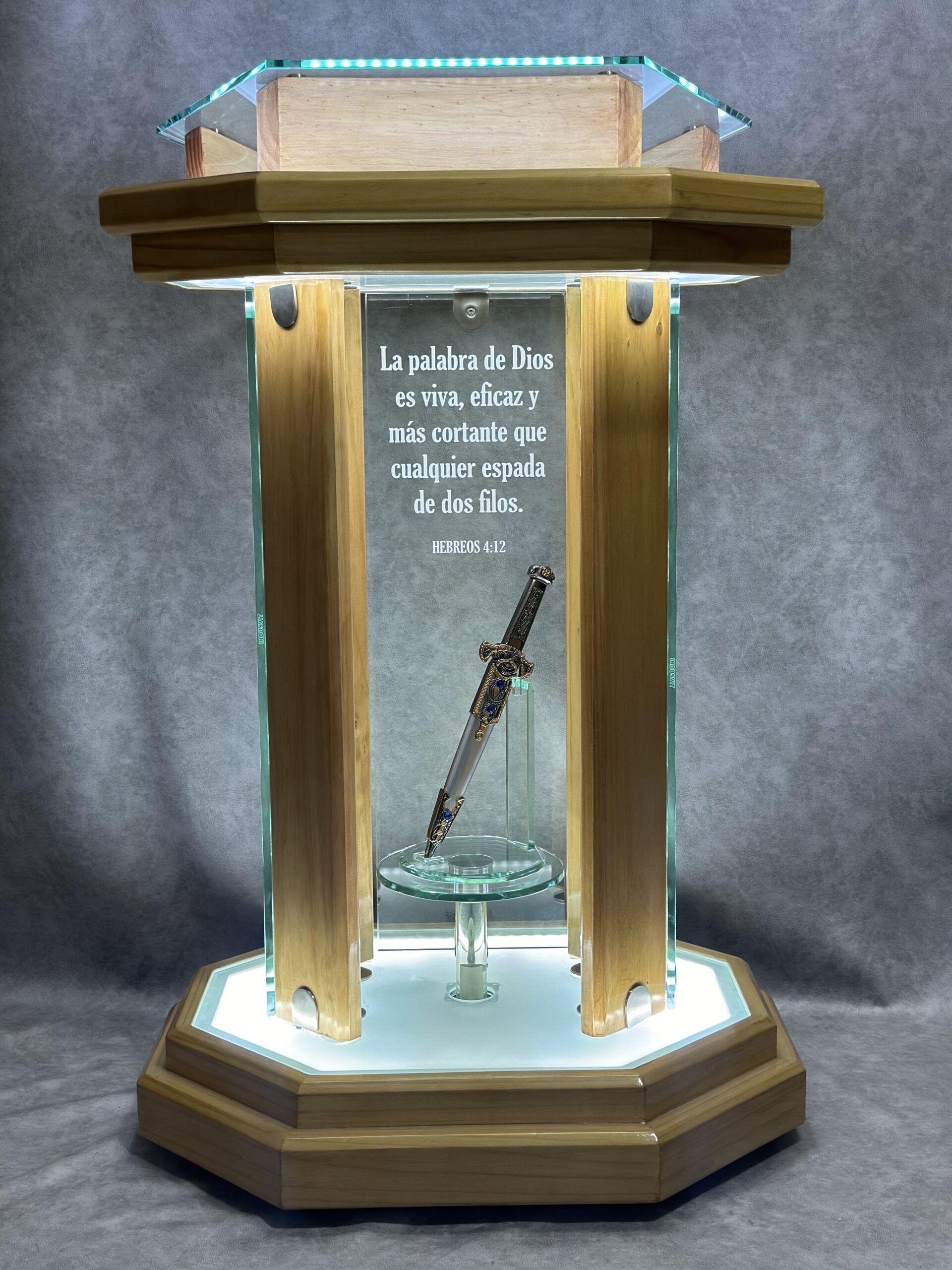 It consists of 3 lighting systems, just like the Plenitud pulpit and the Pacto eterna pulpit, highlighting the decorative elements that you want to use, and, perhaps, the greatest advantage is that although it has all these virtues of the high-end pulpits, which are the most expensive ones that we have in our collection, the ELYON pulpit is very economical, sober, simple and does not take up much space, but it produces a high-impact design image, since it has a motor inside it that rotates the decoration you want to use inside it.